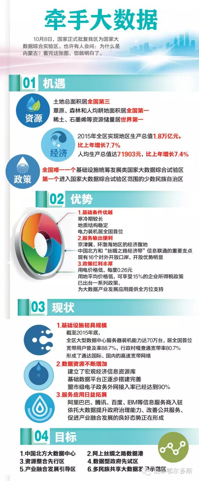鄂爾多斯市發(fā)展大數(shù)據(jù)產(chǎn)業(yè)有著獨(dú)特的區(qū)位、氣候、地質(zhì)、電力、政策優(yōu)勢和條件。鄂爾多斯市于2009年就開始發(fā)展云計(jì)算產(chǎn)業(yè), 2010年被內(nèi)蒙古自治區(qū)政府確定為全區(qū)云計(jì)算產(chǎn)業(yè)發(fā)展重點(diǎn)地區(qū)。2013年順應(yīng)形勢,積極延伸產(chǎn)業(yè)鏈,打造云計(jì)算大數(shù)據(jù)基地。近日,國家發(fā)改委、工信部、網(wǎng)信辦聯(lián)合批復(fù)內(nèi)蒙古為全國唯一一個大數(shù)據(jù)發(fā)展綜合試驗(yàn)區(qū)。鄂爾多斯作為呼包鄂協(xié)同發(fā)展的重要一級,發(fā)展大數(shù)據(jù)產(chǎn)業(yè)潛力巨大、優(yōu)勢明顯、前景看好。