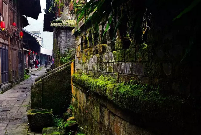 小鎮(zhèn)街道青苔滋生,屋檐前方燈籠若隱若現(xiàn)