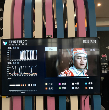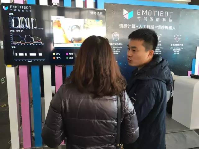 竹間科技的主打產(chǎn)品是 Emotibot,它致力于打造高智商和情商兼?zhèn)涞膫€人智能伴侶?,F(xiàn)場展區(qū)的主要位置被兩個自帶攝像頭的五十寸大屏占據(jù)。