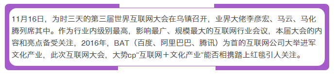 互聯(lián)網消費市場已趨于穩(wěn)定與飽和,而對文化資源有充分把控能力的企業(yè)卻有很大探索空間,文化產業(yè)大佬進軍互聯(lián)網行業(yè)同時,互聯(lián)網巨頭也在涉足文化產業(yè),提高自己的業(yè)務范圍和知名度。2016年以來,阿里影業(yè)、百度影業(yè)、騰訊文學相繼成立。