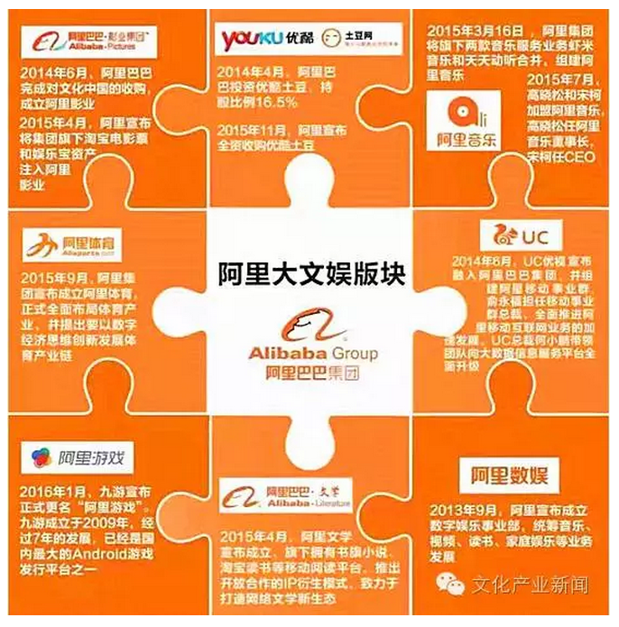 今年6月15日,阿里巴巴官微發(fā)布消息稱,阿里集團CEO張勇宣布正式成立“阿里巴巴大文娛版塊”,旗下囊括阿里影業(yè)、合一集團(優(yōu)酷土豆)、阿里音樂、阿里體育、UC、阿里游戲、阿里文學、數字娛樂事業(yè)部等。至此。阿里集團的文化產業(yè)布局從投資、制作、發(fā)行、渠道到終端,有了完整的大構架。