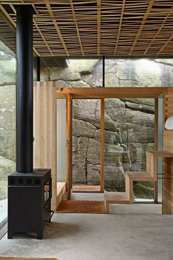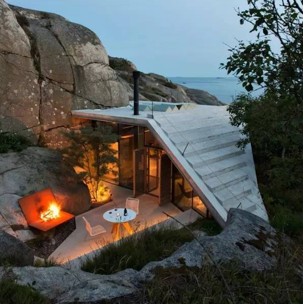 這座小屋建造在斯堪的納維亞大自然的峽灣中,只有一層,屋頂有巨大的露臺(tái)。木質(zhì)的墻壁和家具為房屋增添了一些暖意,浴室可以俯瞰大海。