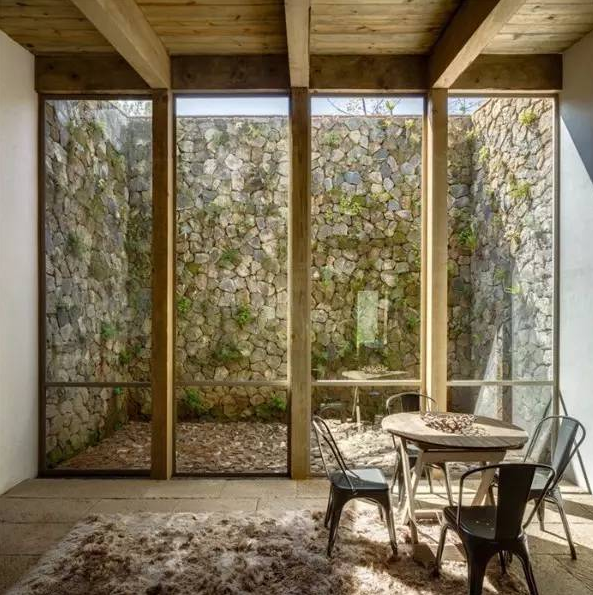 在墨西哥景區(qū)Valle de Bravo里,CC Arquitectos使用風(fēng)化后的石頭、天然木材和大片玻璃創(chuàng)造了這處森林住宅。臥室和起居室之間組成了一個(gè)花園區(qū),這里有水池和浴池,被安裝在灌木叢中。