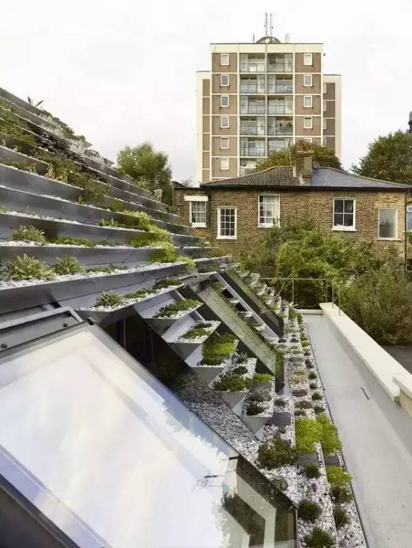 這座住宅位于倫敦哈克尼區(qū),四周多是維多利亞時(shí)期風(fēng)格的建筑。屋頂坡度在30°~45°之間,方便主人爬上爬下,更好地打理這座屋頂上的花園。整個(gè)屋頂上覆蓋了800多株植物,簡(jiǎn)直就是一座植物博物館。