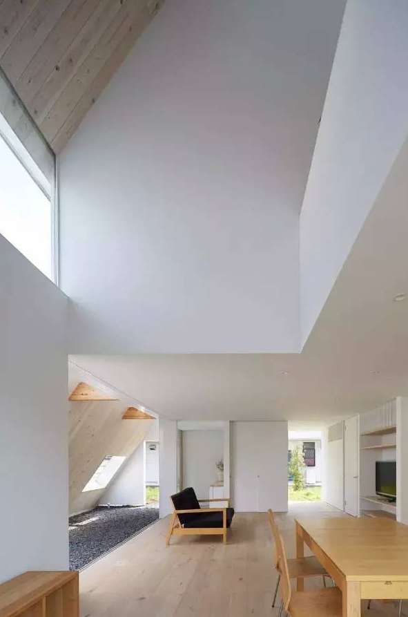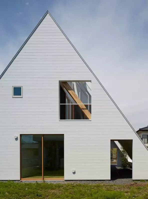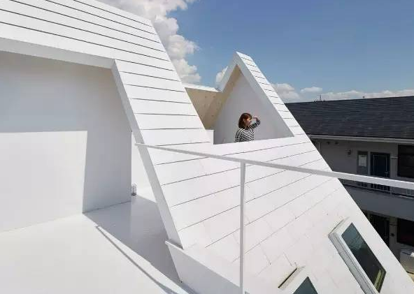 采用了金屬屋頂覆蓋整個(gè)住宅的形式,為露臺(tái)和花園都提供遮蔽。外立面全都覆蓋上了白色鍍鋅合金板條,龐大的屋頂進(jìn)行了一系列剪切開洞設(shè)計(jì),能使自然光照射進(jìn)房間和露臺(tái)。
