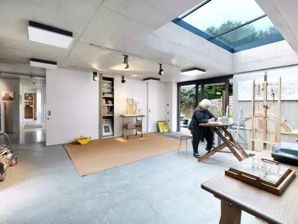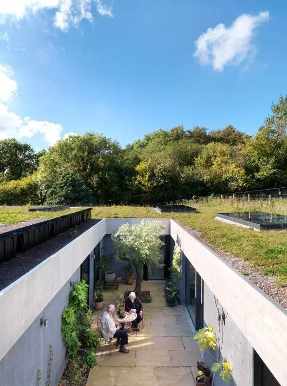 這座英國(guó)鄉(xiāng)村住宅是一對(duì)藝術(shù)家的住所和工作室,有著寬闊的草坪屋頂、玻璃圍合的庭院。住宅依偎在地形之中,從北面基本上看不見它。