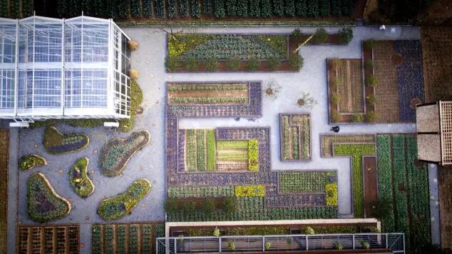 站在巨大的露臺(tái)上,憑欄俯瞰,一派田園風(fēng)光盡收眼底:從腳下的景觀小院,蔬菜花園、迷宮和廊架,老樹(shù)下的休憩區(qū),到近處的玻璃暖房、生態(tài)泳池……