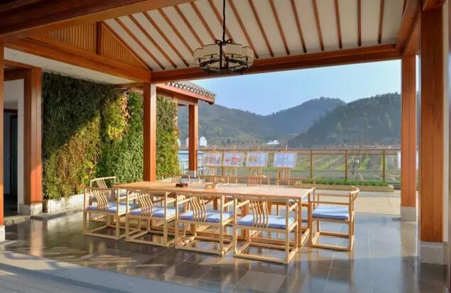 沿樓梯走上2層的合院,室內(nèi)是樸素的裝修,游廊下擺著露木的中式長(zhǎng)桌。