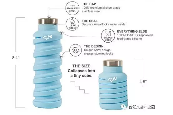 瓶子雖然柔軟但耐熱性也相當(dāng)好,可承受150度高溫。而官方推薦的使用溫度是60讀,為什么?因?yàn)楣枘z的隔熱性不好,裝的水太高溫的話會(huì)燙到手。設(shè)計(jì)這個(gè)que Bottle的是兩位熱愛旅游的環(huán)保主義人事,目地就是要為了提倡環(huán)保。伸長(zhǎng)后三瓶水的量就是一天的喝水量,喜歡探險(xiǎn)、爬山或戶外戶外活動(dòng)的人士不能錯(cuò)過。
