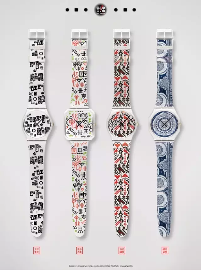 而這幾款文創(chuàng)手表是來(lái)自朱垣銀老師,靈感來(lái)自屯堡民居中的窗戶、水篦子、木雕造型,應(yīng)用在手表的造型上。運(yùn)用安順地區(qū)獨(dú)特的紅崖天書(shū)、苗繡,以及貴州地區(qū)蠟染、水書(shū)文字。呈現(xiàn)在透明的手表上,提煉出時(shí)間長(zhǎng)河中貴州文化的精粹。