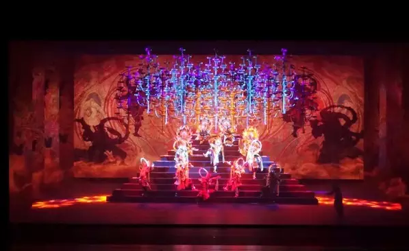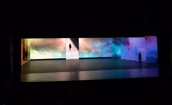 舞臺兩側(cè)LED屏與主背景屏舞美視頻聯(lián)動,形成整體視覺感