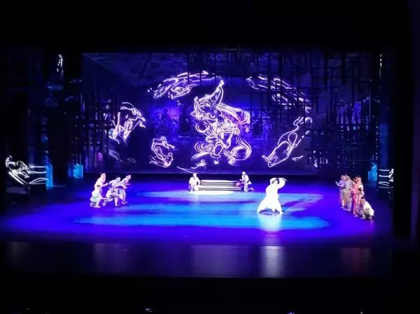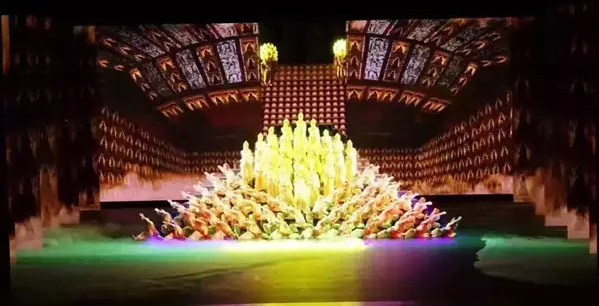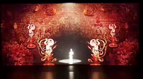 與7月初在香港紅磡體育館的演出相比,此次《絲路花雨》敦煌大劇院演出,舞臺舞美有很大變化。據(jù)數(shù)虎圖像設(shè)計師介紹,整個舞臺呈包裹式,意在呈現(xiàn)強(qiáng)烈的3D立體演出效果。