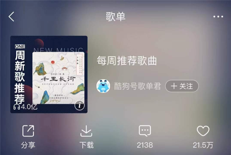 8月31日,由國(guó)家文物局指導(dǎo)、中國(guó)文物保護(hù)基金會(huì)主辦的“大運(yùn)河文化帶文化遺產(chǎn)創(chuàng)新創(chuàng)意設(shè)計(jì)大賽”閉幕式暨頒獎(jiǎng)典禮在京舉辦??峁芬魳?lè)作為國(guó)內(nèi)領(lǐng)先的數(shù)字音樂(lè)服務(wù)商,攜手網(wǎng)絡(luò)原創(chuàng)音樂(lè)社團(tuán)汐音社,為此次大賽策劃籌備了主題曲《千里長(zhǎng)河》,并由知名原創(chuàng)古風(fēng)歌手、5sing中國(guó)原創(chuàng)音樂(lè)基地音樂(lè)人倫桑演唱。主題曲上線酷狗音樂(lè)“每周推薦”歌單,目前播放量已過(guò)4億,獲得眾多網(wǎng)友的關(guān)注。