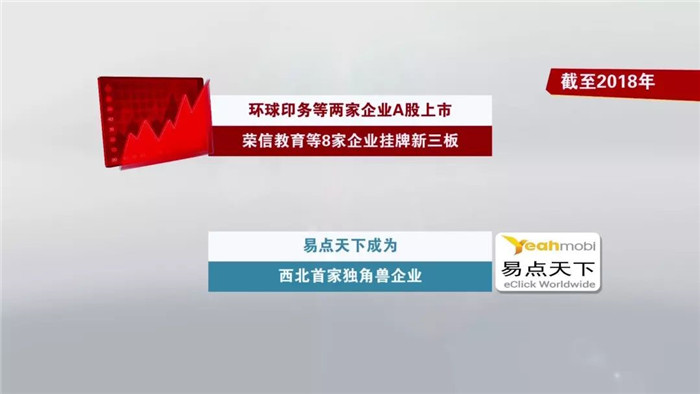 截至目前,全市文化科技企業(yè)達(dá)1.6萬家,10個(gè)園區(qū)被評為市級示范園區(qū),100家企業(yè)被評為市級示范企業(yè);一批重大文化科技融合項(xiàng)目簽約落地,截至2018年,環(huán)球印務(wù)等兩家企業(yè)A股上市,榮信教育等8家企業(yè)掛牌新三板,易點(diǎn)天下成為西北首家獨(dú)角獸企業(yè)。